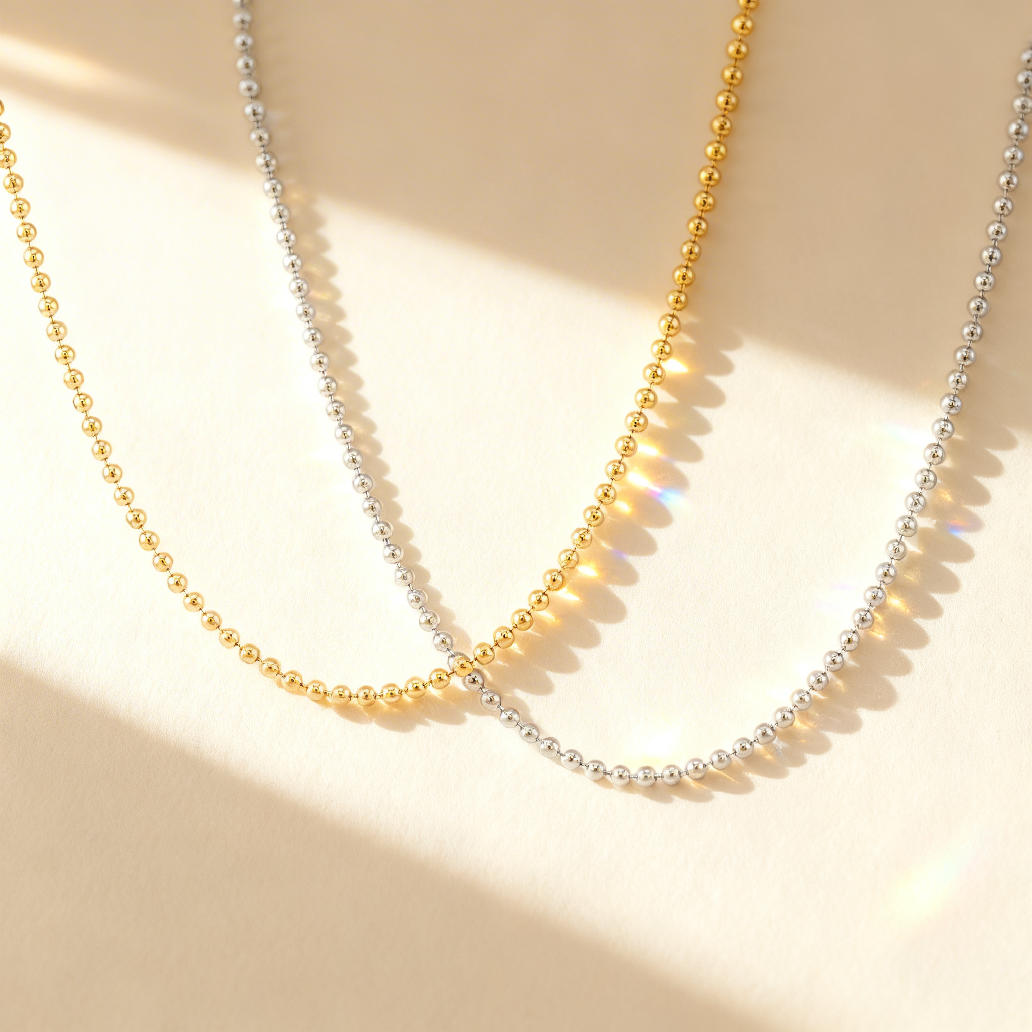 Crafted from sterling silver and plated with White gold or Beige gold , this Necklace come in a Ball Chain Necklace style. (length 16"-18").