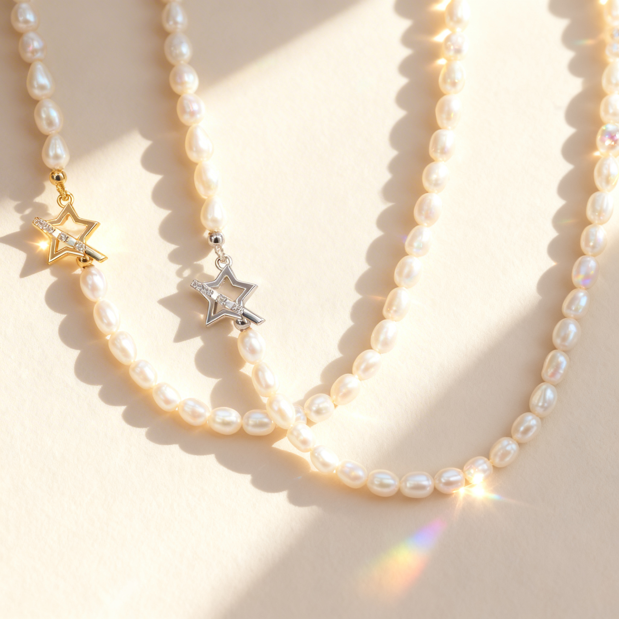 Crafted from sterling silver and plated with White gold or Beige gold , this Necklace is adorned with Freshwater Pearls and White Zircon. (length 15" and 16").